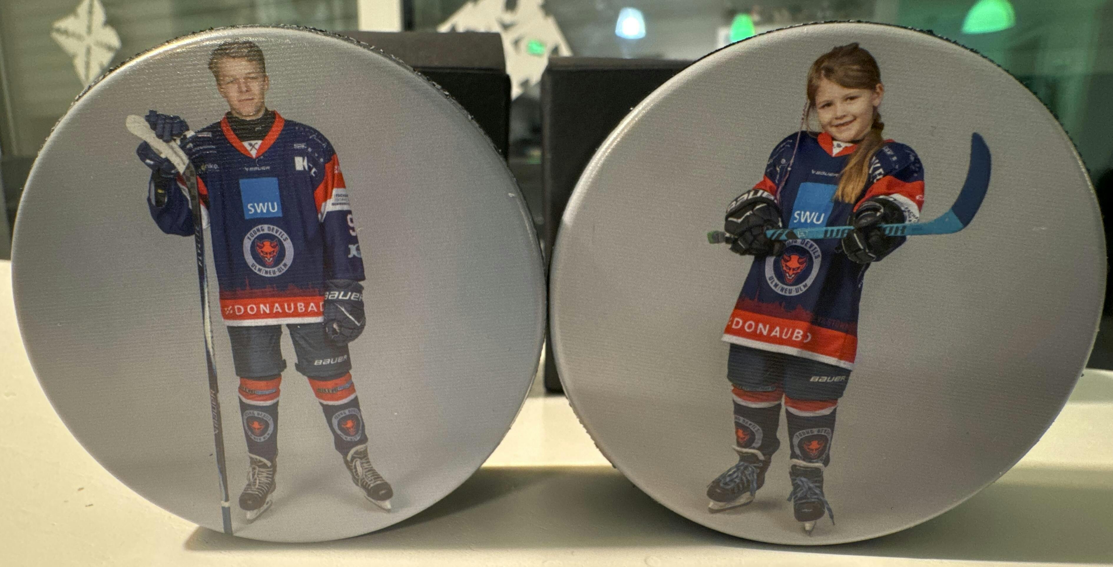 Wir bedrucken den offiziellen GUFEX Spielpuck mit deinem Wunschmotiv in brillantem Digitaldruck auf der Vorderseite. Ob Teamfoto, Lieblingsmoment oder ein persönlicher Gruß – dieser Puck ist mehr als nur ein Souvenir. Er ist ein echtes Statement für alle, die Eishockey im Herzen tragen.
